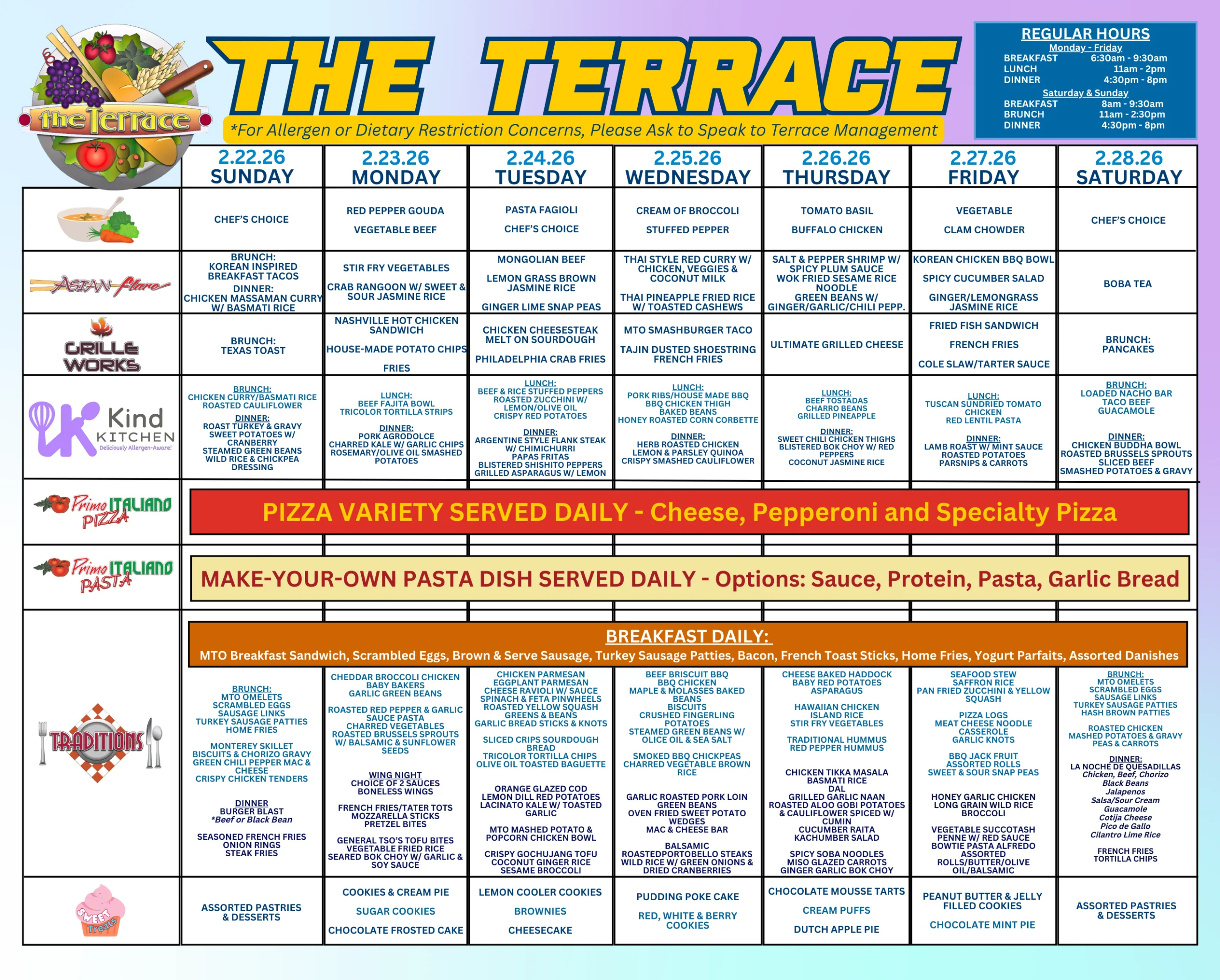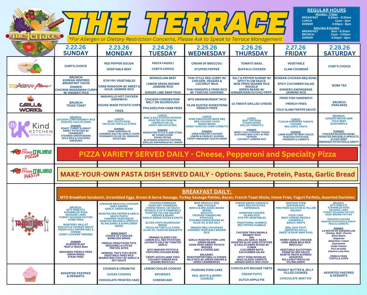 The Terrace serves up a world of flavor with something tasty for everyone! From allergen-friendly eats to dishes inspired by cultures around the globe, our menu celebrates variety and makes sure every student can dig into something delicious and satisfying. Located on the 2nd floor of Central Dining Hall.